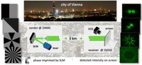 Рис. Схема эксперимента. Информация, закодированная в лазерном луче с помощью пространственного модулятора света, передавалась по открытой атмосфере над вечерней Веной. Слева показаны примеры распределения фазы в поперечном сечении пучка. Приемник регистрировал на экране картины (показаны справа), которые анализировались самообучающейся нейронной сетью, и по ним восстанавливалась информация.