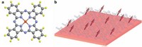 a – Молекула фталоцианина меди (красным, синим, серым и желтым цветом показаны атомы меди, азота, углерода и водорода, соответственно); b – схематическое изображение пленки с электронными спинами (стрелки).