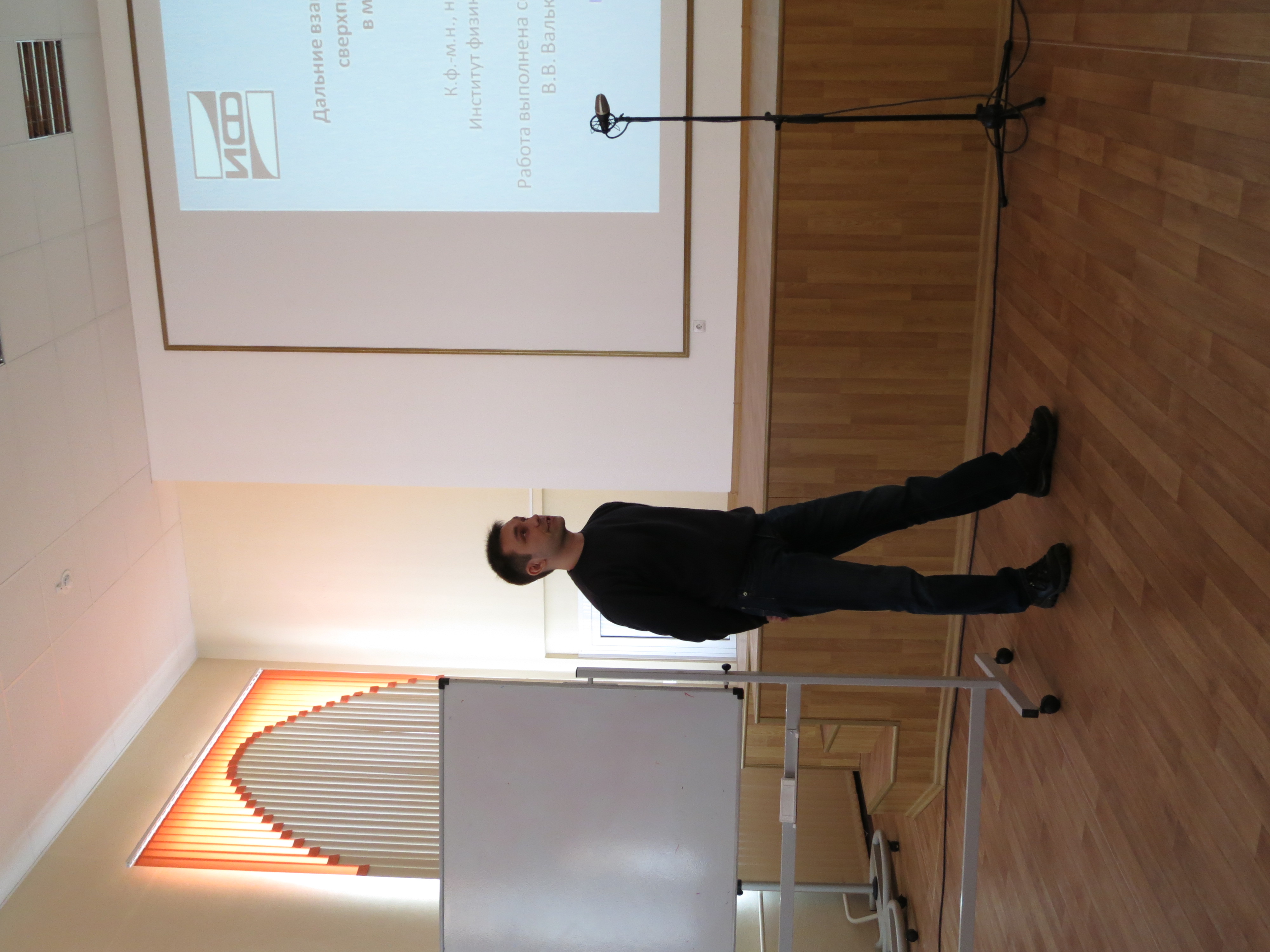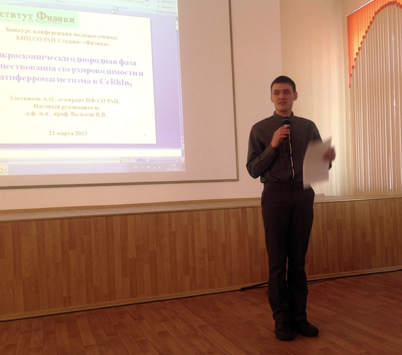 Дмитрий Петров на конкурсе-конференции молодых ученых Красноярского научного центра СО РАН, 2013 год. Доклад "Исследование морфологии, магнитных свойств и магнитного кругового дихроизма наночастиц Ni, полученных методом ионной имплантации в матрице аморфного SiO2 "