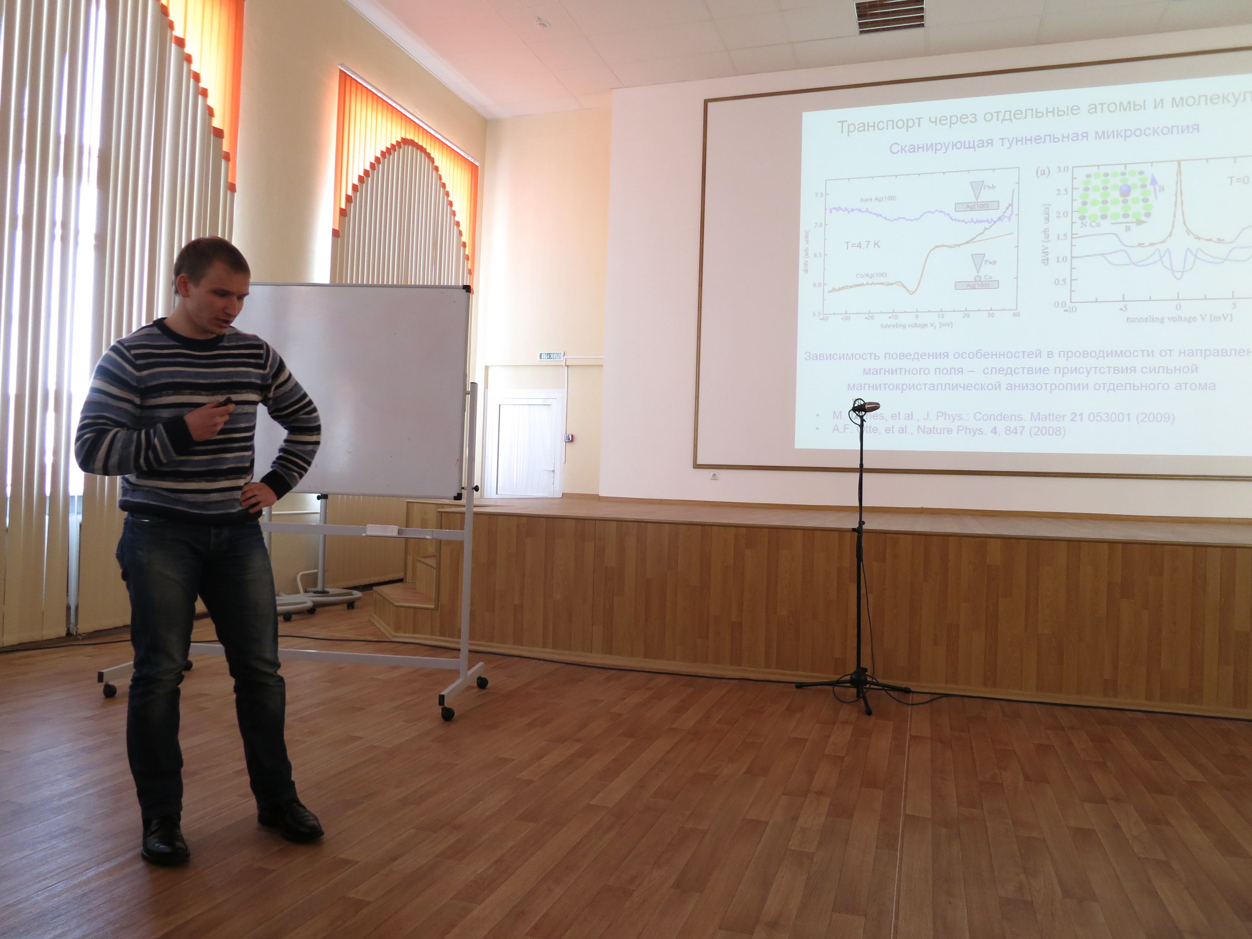 Сергей Аксенов, старший научный сотрудник лаборатории теоретической физики Института физики им. Л.В. Киренского Сибирского отделения Российской академии наук (ИФ СО РАН), на конкурсе-конференции молодых ученых Красноярского научного центра СО РАН в 2013 году с докладом "Проявление неравновесных эффектов при транспорте через магнитную примесь ". Красноярск.