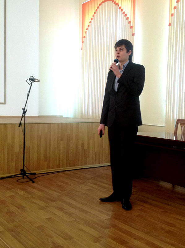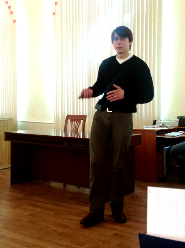 Сергей Аксенов, старший научный сотрудник лаборатории теоретической физики Института физики им. Л.В. Киренского Сибирского отделения Российской академии наук (ИФ СО РАН), на конкурсе-конференции молодых ученых Красноярского научного центра Сибирского отделения РАН в 2013 году. Красноярск.