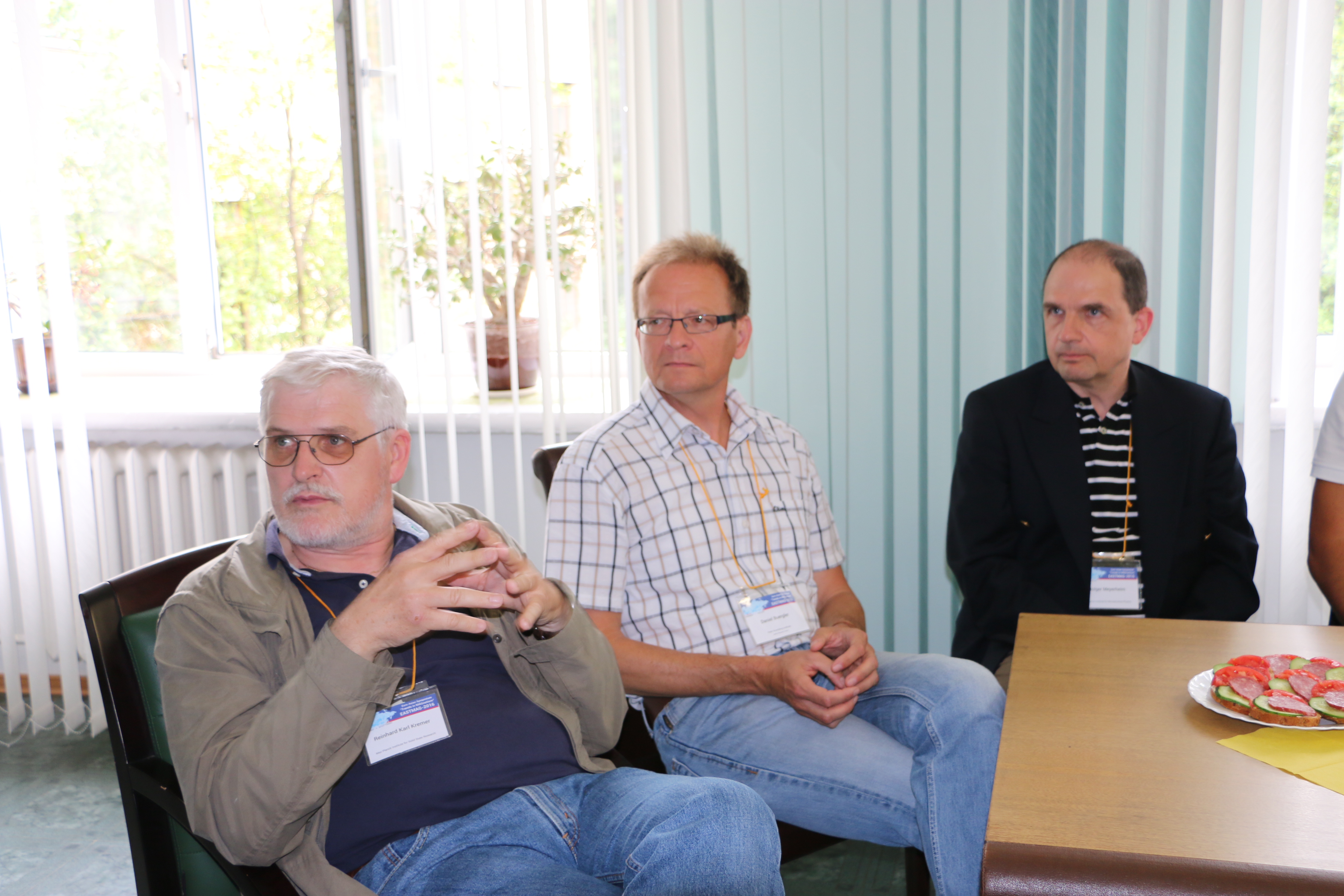 Рейнхард Кремер, Даниель Бюрглер и Хольгер Майерхайм (Германия) в кабинете директора Института физики.