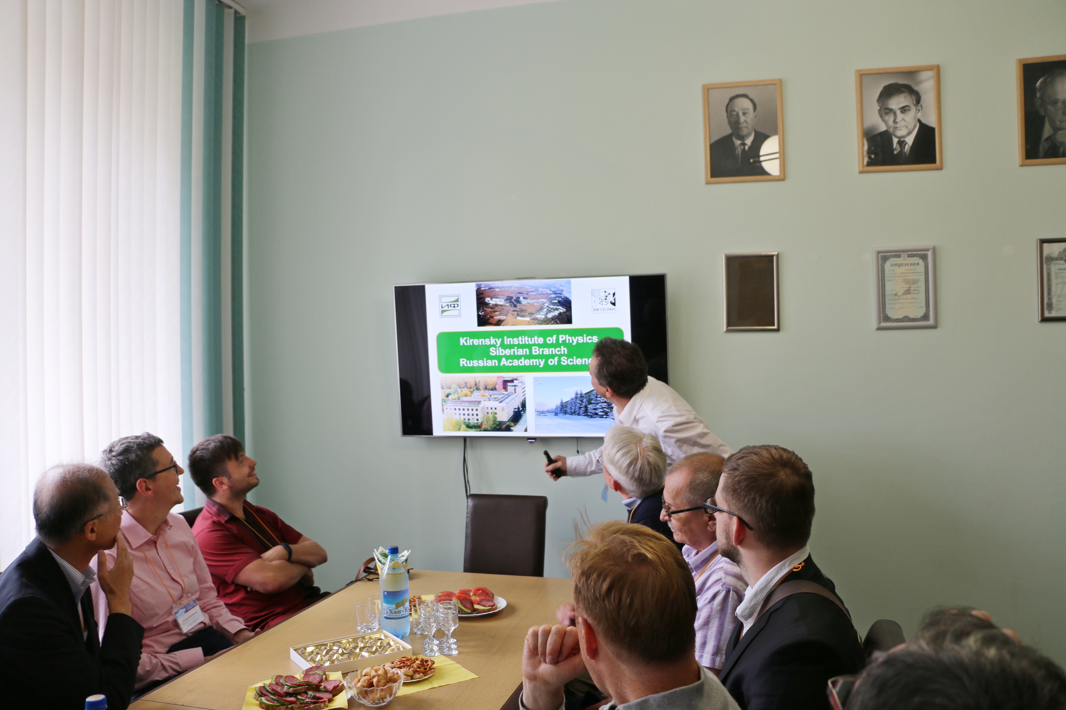 Участники Евро-Азиатского симпозиума "Прогресс в магнетизме" (EASTMAG-2016), организованного и проведенного в Красноярске в августе 2016 года, в кабинете директора Института физики Сибирского отделения Российской академии наук (ИФ СО РАН) Н.В. Волкова. Рассказывает об Институте физики Волков.