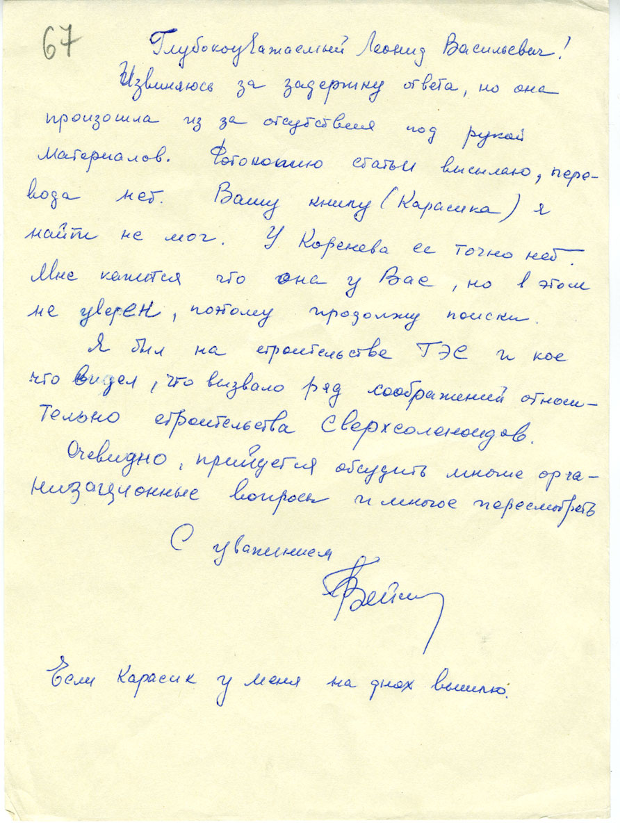 Вы здесь: Главная / Документы / Переписка Л. В. Киренского / Письма к Л. В. Киренскому / Г. С. Вейсиг / Георгий Степанович Вейсиг, заведющий лабораторией сильных магнитных полей (СМП) Института физики СО АН СССР (1969-1973 ), составитель задания на проектирование центра Сверхсильных магнитных полей в Красноярске.