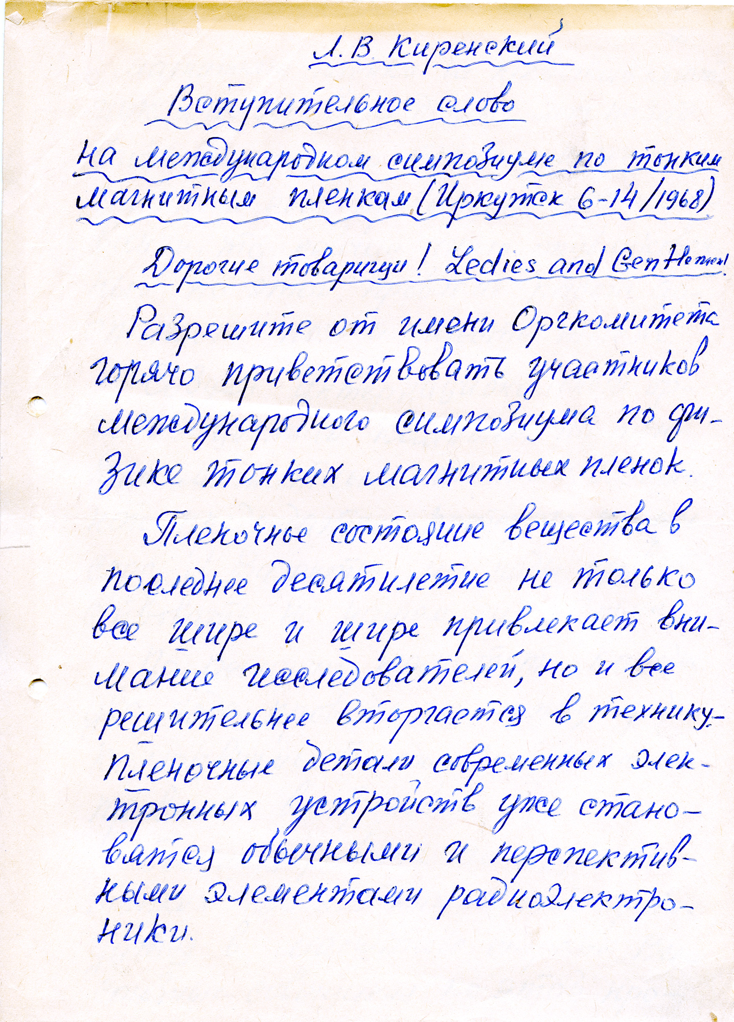 Вступительное слово на международном симпозиуме по тонким магнитным плёнкам