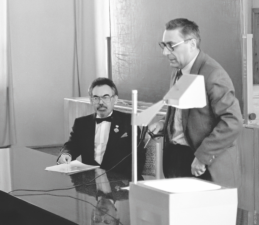 Встреча с Нахумом Мойшовичем Саланским (слева) в Институте физики им. Л.В. Киренского Сибирского отделения Академии наук СССР (ИФ СО АН СССР) во время его приезда в Красноярск. Саланский возглавлял лабораторию высокочастотных и ипульсных свойств тонких магнитных пленок в ИФ с 1967 по 1975 год. Затем жил и работал в Канаде. Выступает Вальтер Алексеевич Игнатченко, фото 1989 года.