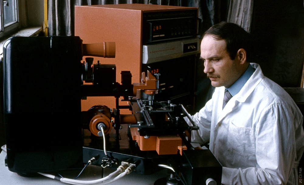 На основе использования новых принципов, явлений и эффектов, обнаруженных в процессе проведения фундаментальных исследований в Институте физики им. Л.В.Киренского Сибирского отделения Академии наук СССР (ИФ СО АН СССР), активно развивалось научное приборостроение. На снимке: Зайцев Николай Кондратьевич, сотрудник лаборатории эмиссионной спектроскопии института , настраивает установку автоматического компьютерного профилографа для Норильского горно-металлургического комбината, (разработан и изготовлен в институте) предназначенного для автоматизации спектрального анализа в производственных условиях. Фото 1984 года.