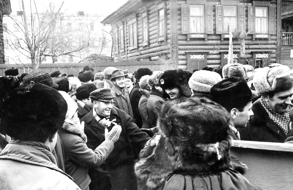 Ноябрь 1972 год. Демонстрация, посвященная Октябрьской революции 1917 года. В центре Александров К.С., член-корреспондент АН СССР, заместитель директора по научной работе Института физики им. Л.В. Киренского Сибирского отделения Академии наук СССР (ИФ СО АН СССР). Красноярск.