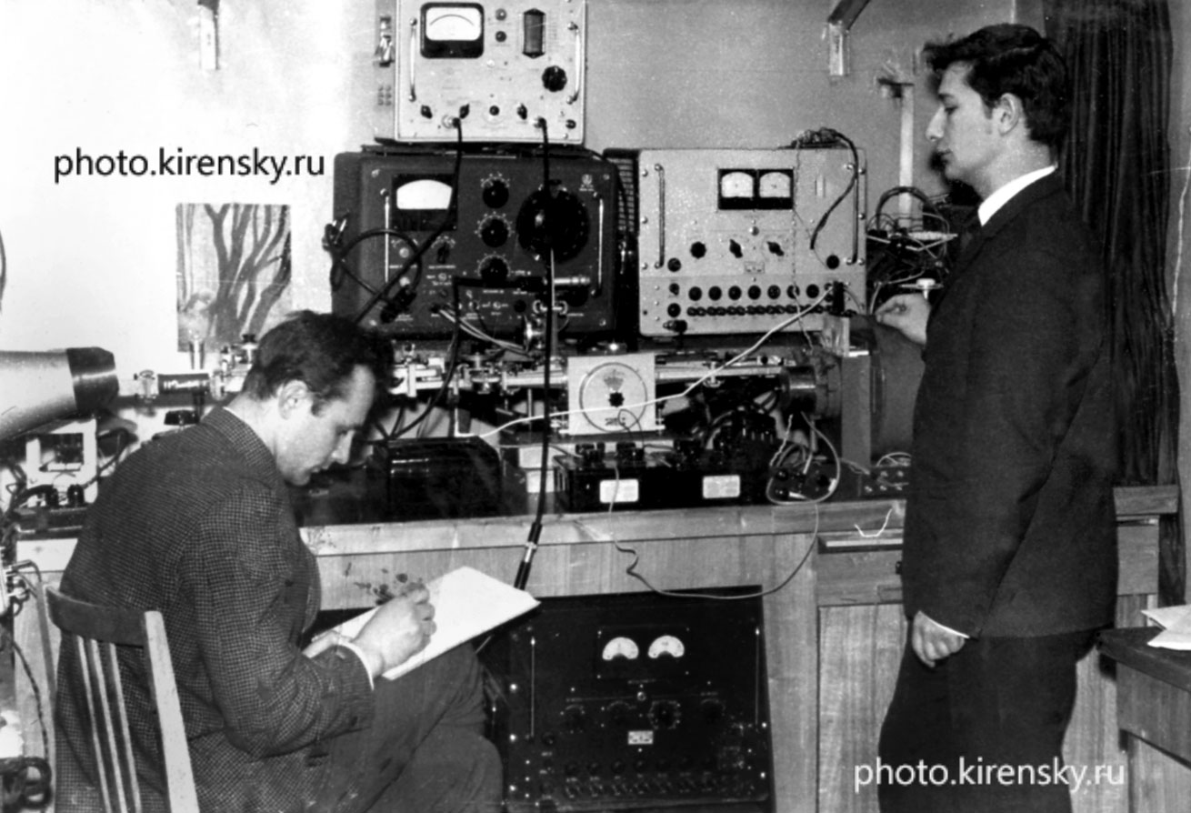1966 год. Старший инженер Бержанский В.Н. (справа) и аспирант Пухов И.К., сотрудники лаборатории магнитных материалов Института физики Сибирского отделения Академии наук СССР (ИФ СО АН СССР), за разработанной и собранной ими установкой по исследованию процессов ферромагнитной релаксации в монокристаллах ферритов методом сверхвысоких частот (СВЧ). Красноярск.