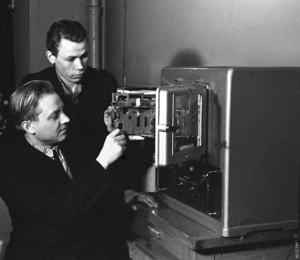 Бондарев А.Ф. (слева) и Русецкий Ю.С, сотрудники лаборатории молекулярной спектроскопии Института физики Сибирского отделения Академии наук СССР (ИФ СО АН СССР), у спектрометра ДФС-12. Фото 1965 года. Красноярск.