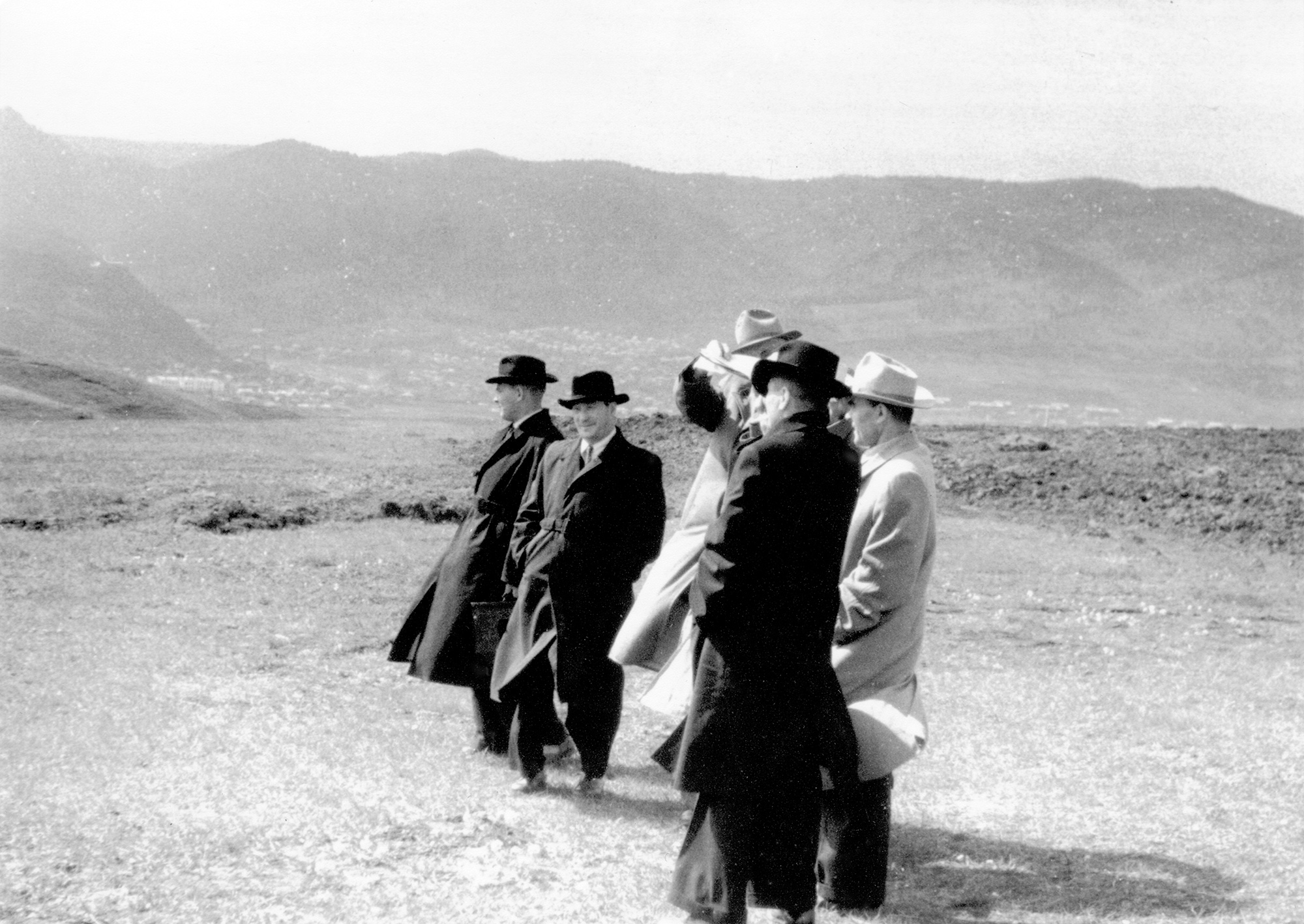 Когда в 1957 году речь зашла о строительстве Академгородка в Красноярске, где в дальнейшем смогли бы разместиться и другие академические институты, кроме уже открытого Института физики Сибирского отделения Академии наук СССР, Леониду Васильевичу Киренскому, директору Института физики, хотелось вынести городок за пределы города. Начались поиски места для городка. Одним из вариантов было так называемое "Манское блюдце", окруженное горами плоскогорье в 40 км от Красноярска. От этой идеи отказались и остановились на втором варианте - Афонтова гора на берегу Енисея в 5 км от города. На снимке комиссия по выбору площадки на Афонтовой горе. Второй слева Л.В. Киренский