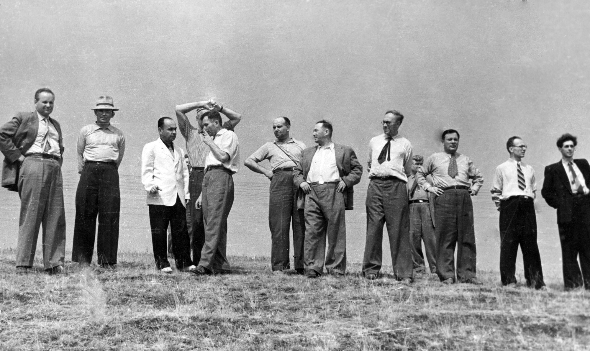 Июнь 1957 года. Представители Сибирского отделения Академии наук СССР, красноярских партийных и советских организаций и Института физики Сибирского отделения Академии наук СССР (ИФ СО АН СССР), осматривают площадку будущего строительства комплекса зданий Института физики (площадку будущего Академгородка). Слева направо: академик С.А. Христианович, И.А. Терсков, Г.Б. Кочар, П.Д. Сабуров, А.Я. Власов, В.М. Кляровский, Л.В. Киренский, академик М.А. Лаврентьев, Н.Д. Кузьмин, Г.Д. Лапчинский, Л.В. Брятов, И.И. Гительзон. Красноярск.