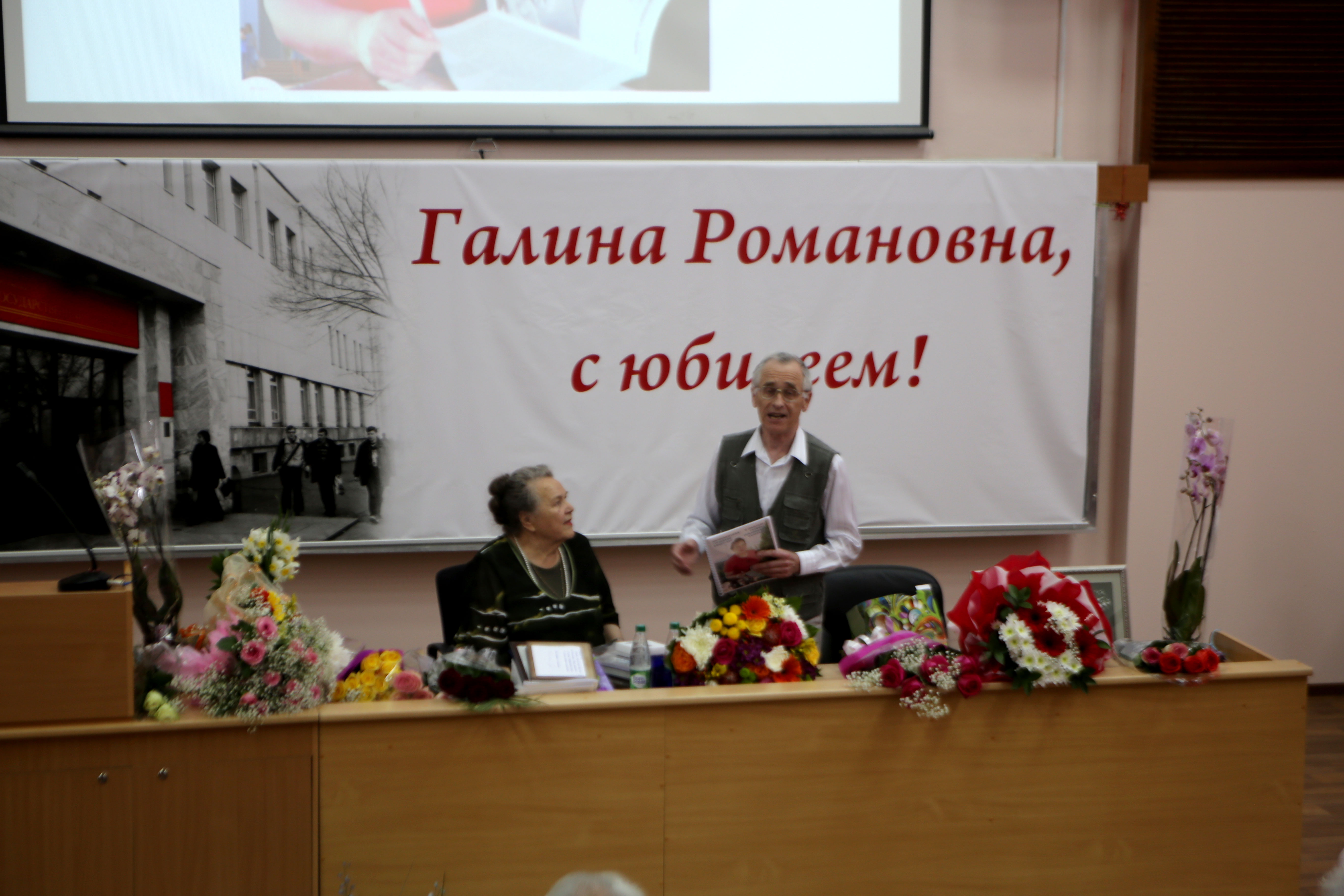 2015 год,21 мая. Г.Р. Балуеву с 80-ним юбилеем поздравляет А.В. Сорокин и вручает ей изданный к юбилею буклет с воспоминаниями бывших выпускников о годах учебы в Красноярском государственном университете и встречах с Галиной Романовной.