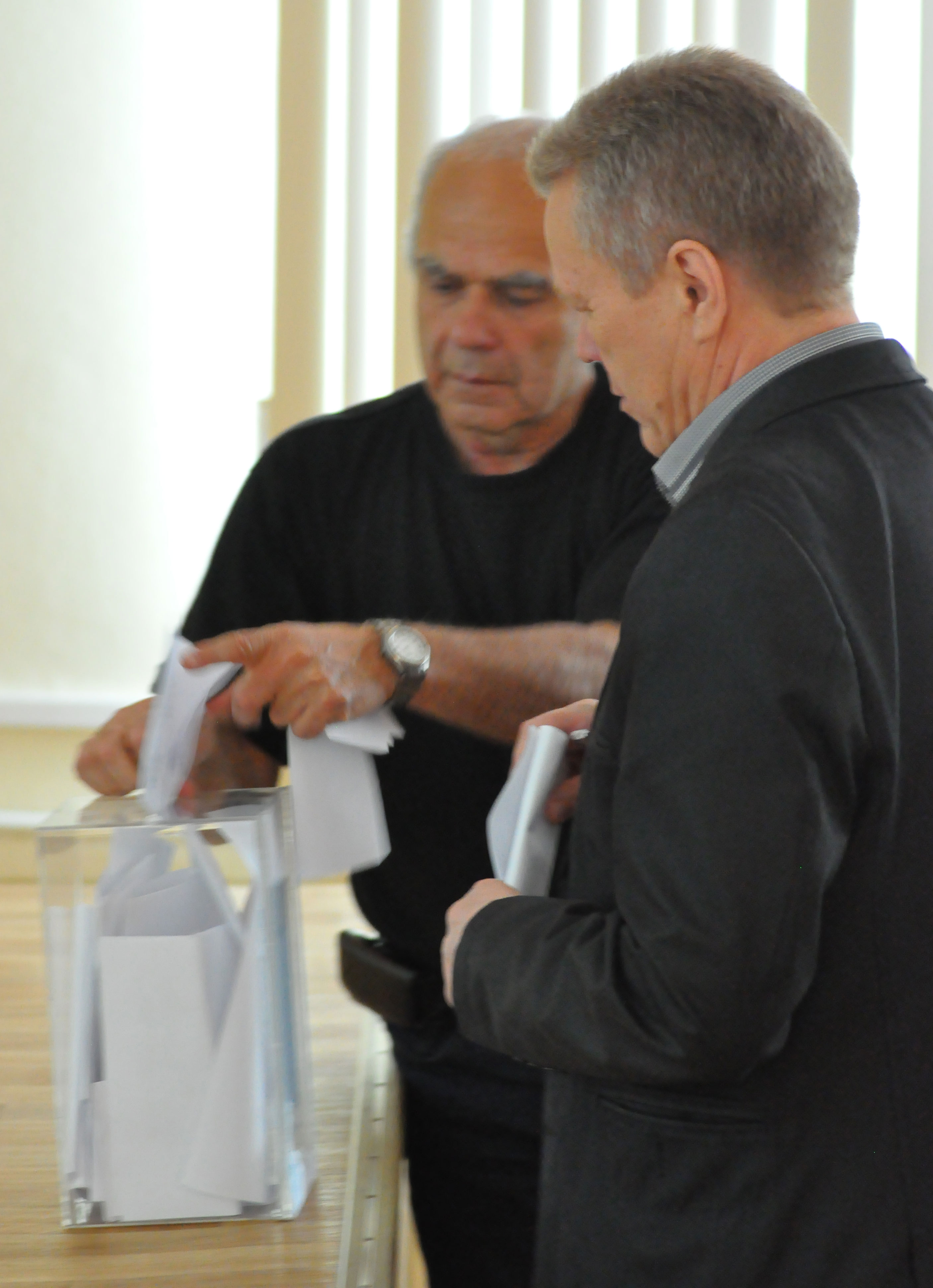 2015 год, 29 мая. На заседании ученого Совета Института физики им. Л.В. Киренского Сибирского отделения Российской академии наук. Во время голосования. Голосуют: Г.Н. Чурилов, заведующий лабораторией аналитических методов исследования вещества (слева) и В.Я. Зырянов, заместитель директора института по научной работе, заведующий лабораторией молекулярной спектроскопии. Красноярск.