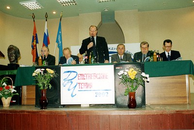 2002 год. Академик Александров К.С.(второй слева) в президиуме научных чтений, проводимых ежегодно в Сибирском государственном аэрокосмическом университете в память об академике Решетнёве М.Ф. Железногорск, Красноярского края.