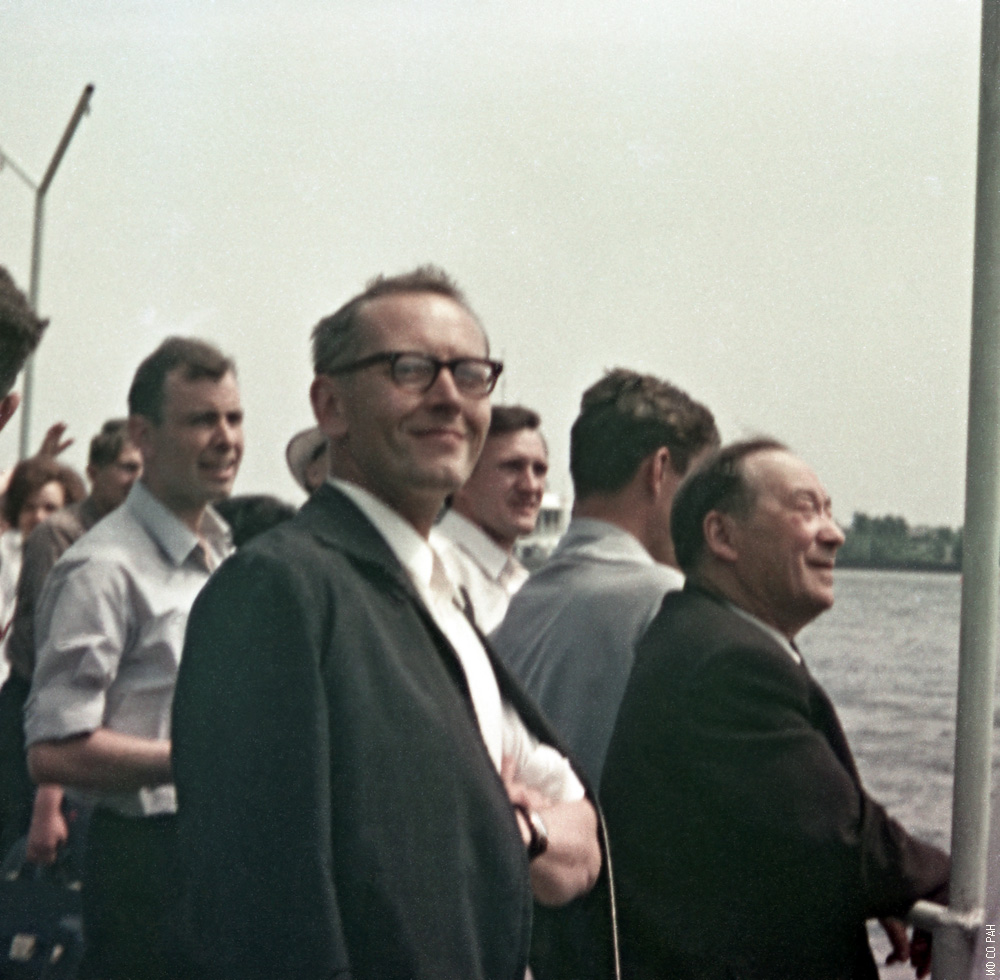 Александров К. С. (слева) и Киренский Л. В. (справа) среди провожающих теплоход «В. Чкалов», на котором отправлялись в рейс Красноярск-Дудинка-Красноярск участники Всесоюзного совещания по физическим свойствам монокристаллов ферритов. Совещание было подготовлено и проведено Инсттутом физики Сибирского отделения Академии наук СССР в июне 1969 года.