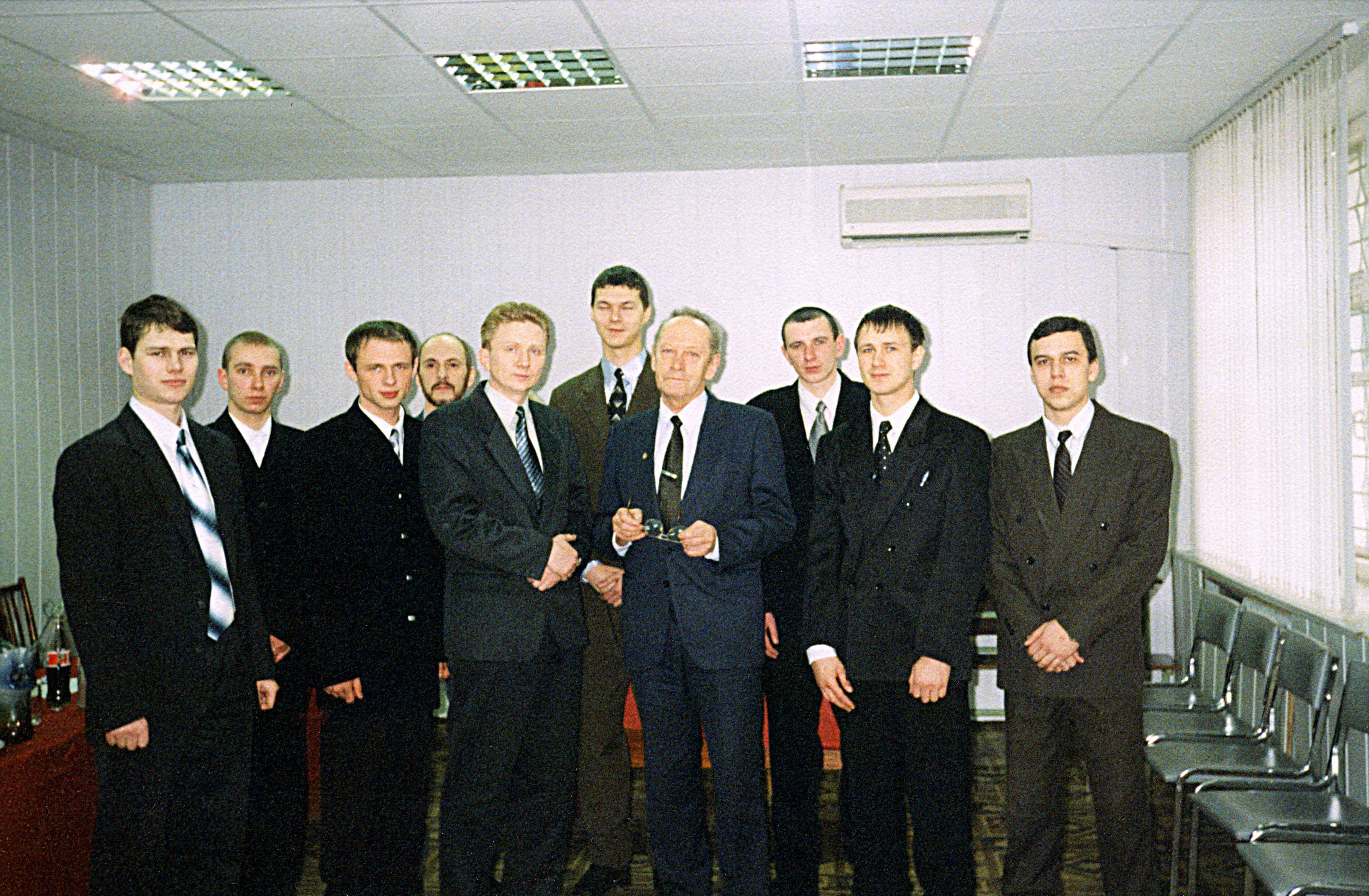 Февраль 2002 года. Академик Александров К.С., директор Института физики им. Л.В. Киренского Сибирского отделения Российской академии наук (в центре с очками в руках), с выпускниками Красноярского государственного университета и Сибирского аэрокосмического университета, участниками деятельности межвузовского инженерно-физического отделения Красноярского университета и Сибирского государственного аэрокосмического университета..