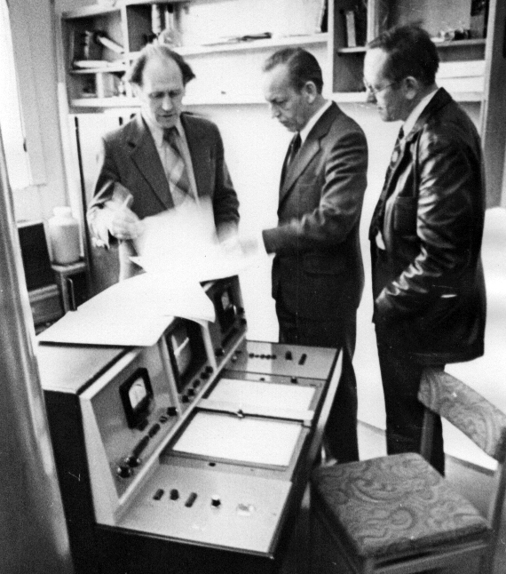 1981 год. Визит в Институт физики им. Л.В. Киренского Сибирского отделения Академии наук СССР (ИФ СО АН СССР) председателя Президиума Сибирского отделения АН СССР Коптюга В.А. Слева направо: Зеер Э.П., заведующий лабораторией радиоспектроскопического структурного анализа, Коптюг В.А., Александров К.С., директор института.