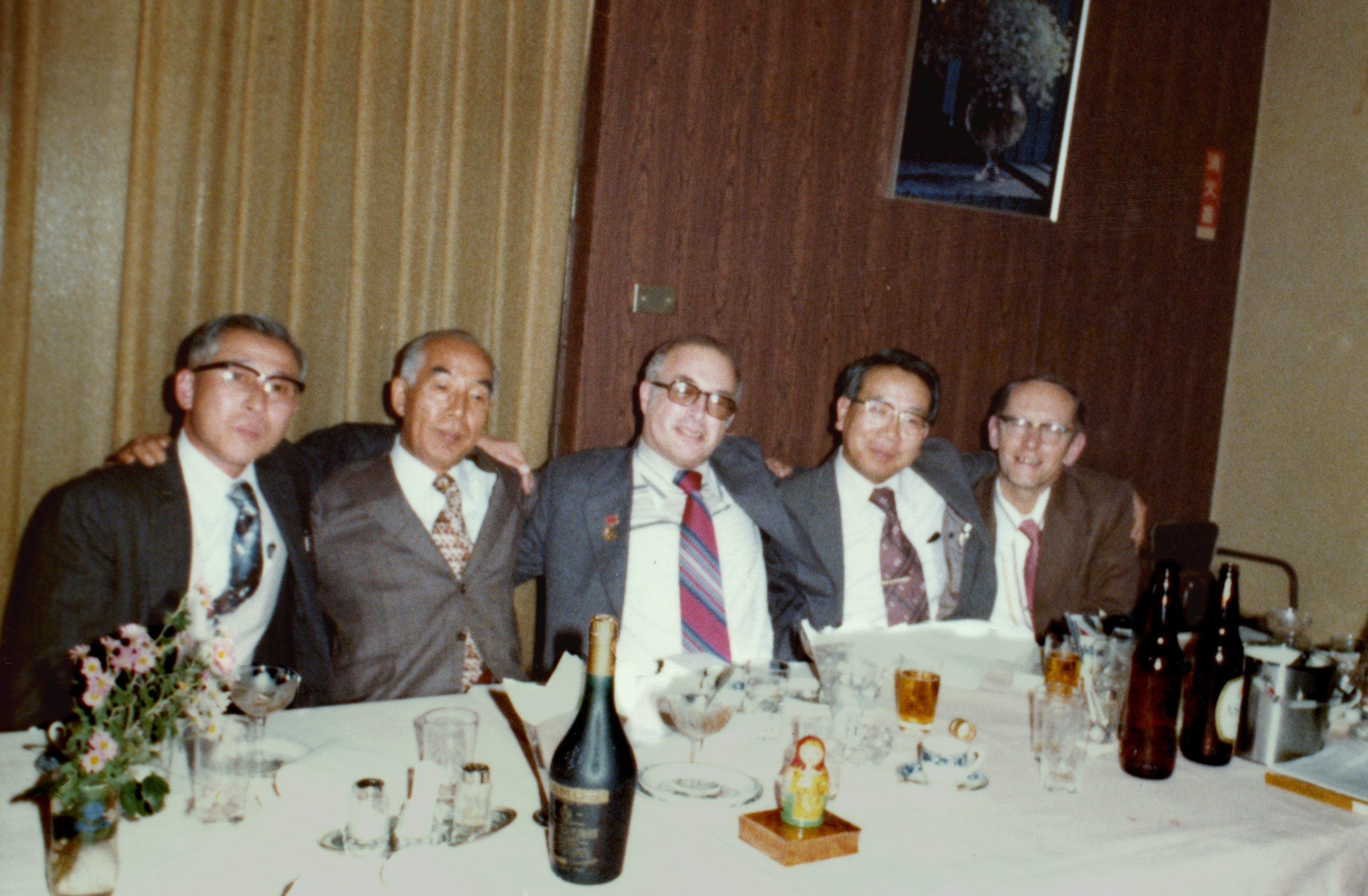 В гостях у доктора Ишибаши (второй справа). Академик Александров К.С. (крайний справа), заместитель директора Института физики им. Л.В. Киренского Сибирского отделения Академии наук СССР по научной работе, в Японии с целью подготовки второго семинара по сегнетоэлектричеству. В центре снимка профессор Шувалов Л.А., ноябрь 1977 года.