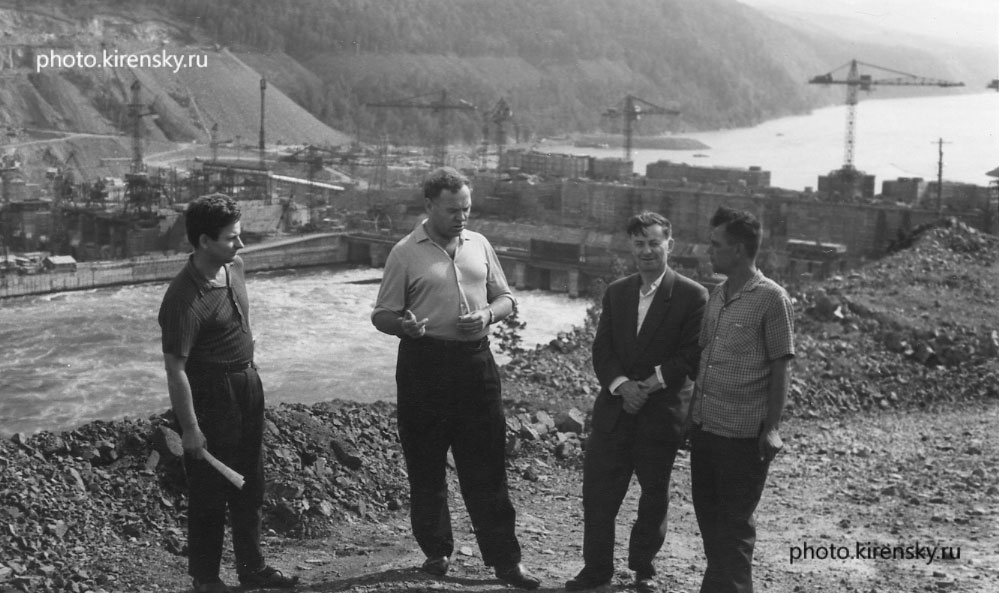 1965 год. А.И. Дрокин, заместитель директора по научной работе Института физики Сибирского отделения Академии наук СССР (ИФ СО АН СССР) (СО АН СССР с 1991 года СО РАН) (второй слева), с гостями института на строительстве Красноярской ГЭС.