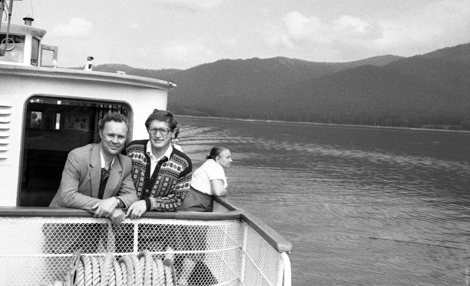 Хрусталев Б.П. (слева) и Миронов В.Л. - участники второго Семинара «Резонансные, нелинейные, оптические процессы в газах», организованного и проведенного в Дивногорске (город на Енисее под Красноярском) Институтом физики им. Л.В. Киренского Сибирского отделения Академии наук СССР (ИФ СО АН СССР) в 1986 году. Рейсовый теплоход Красноярск-Дивногорск по Енисею.