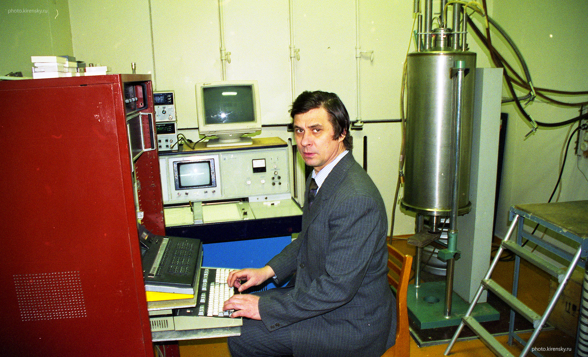 Иванов Юрий Николаевич, старший научный сотрудник лаборатории радиоспектроскопического структурного анализа Института физики им. Л.В. Киренского Сибирского отделения Российской академии наук (ИФ СО РАН), у ЯМР спектрометра со сверхпроводящим соленоидом. Фото 1996 года.