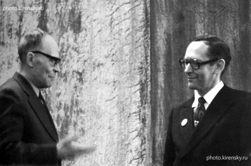 Коршунов Анатолий Васильевич (слева), доктор физико-математических наук, профессор, Заслуженный деятель науки РСФСР, заведующий отделом оптики Института физики, и Александров Кирилл Сергеевич, член-корреспондент АН СССР, директор Института физики им. Л.В. Киренского Сибирского отделения Академии наук СССР. Красноярск, 1981 год.