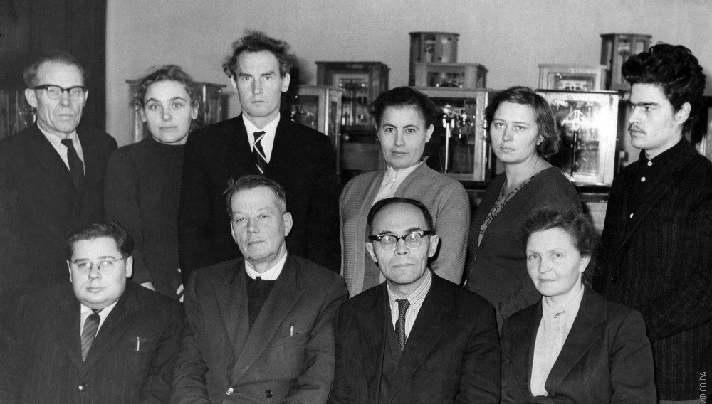 1956 год. Сотрудники кафедры физики Сибирского государственного лесотехнического института. Сидят, второй слева- Сарапкин П.С., рядом с ним Коршунов А.В. Красноярск.