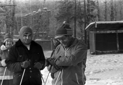 Лыжные прогулки в Академгородке Красноярска. На снимке сотрудники Института физики им. Л.В. Киренского Сибирского отделения Академии наук СССР (ИФ СО АН СССР). Слева направо: Александрова И.П., заведующая лабораторией кинетических процессов, Айзенберг Л.А., заведующий лабораторией теории функций и академик Александров К.С., директор института. Фото 1988 года.