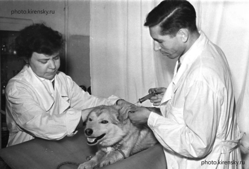 1962 год. В.П. Макаров и Н.Б. Хрипач, младшие научные сотрудники лаборатории биофизики Института физики Сибирского отделения Академии наук СССР (ИФ СО АН СССР) (СО АН СССР с 1991 года СО РАН), занимались исследованиями реакций эритронов на лучевое воздействие с помощью реактивных изотопов. На снимке: момент проведения контрольного анализа крови собаки перед тем, как облучить ее кобальтовой пушкой. Красноярск.