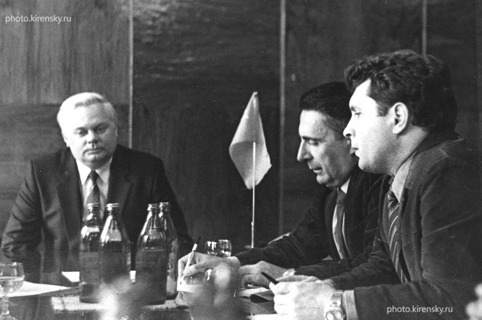 Снимок сделан в Иркутске на Международном симпозиуме (коллоквиуме) по физике магнитных пленок в 1968 году. Такой симпозиум был организован и проведен Институтом физики Сибирского отделения Академии наук СССР (ИФ СО АН СССР) совместно с Иркутским государственным педагогическим институтом по поручению Совета Министров СССР по науке и технике. Он был первым в СССР и третьим в мире. Слева направо: Руссов Глеб Иванович, ректор Иркутского пединститута, Игнатченко Вальтер Алексеевич, заведующий теоретическим отделом Института физики, Захаров Юрий Владимирович, ученый секретарь Института физики.