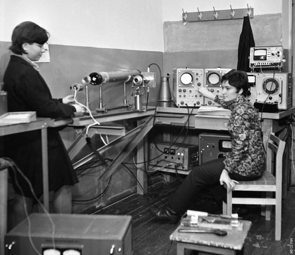Морозова Т.П. (слева) и Сливинская А.Т. , сотрудники лаборатории физики магнитных явлений Института физики Сибирского отделения Академии наук СССР (ИФ СО АН СССР), за сборкой установки по исследованию эффекта Керра. Снимок 1969 года. Красноярск.