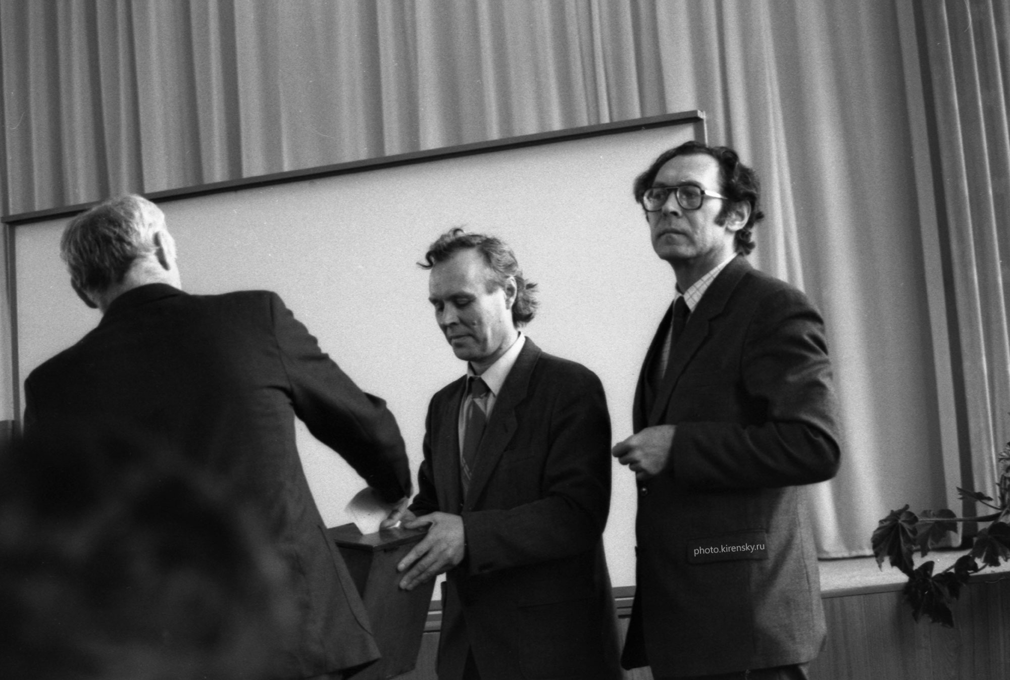 Хрусталев Б.П.(в центре), заместитель директора по научной работе и Якубайлик Э.К., ученый секретарь Института физики им. Л.В. Киренского Сибирского отделения Российской академии наук (ИФ СО РАН), на ученом совете института. Идет голосование. Снимок 1993 года. Красноярск.