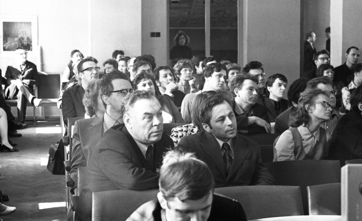 В конференц-зале на общеинститутском физическом семинаре Института физики Сибирского отделения Академии наук СССР (ИФ СО АН СССР). Во втором ряду, слева направо: Дрокин А. И., Петраковский Г. А., Михайловская Л. В. Фото 1969 года. Красноярск.