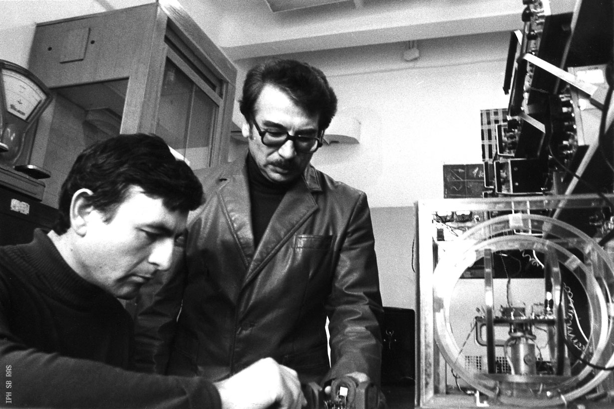 1977 год. В.В. Поляков, старший инженер лаборатории физики магнитных пленок (слева) и Г.И. Фролов, заведующий лабораторией физики магнитных пленок Института физики им. Л.В. Киренского Сибирского отделения Академии наук СССР (ИФ СО АН СССР), за установкой для исследования характера процесса импульсного перемагничивания тонких магнитных пленок. Красноярск.