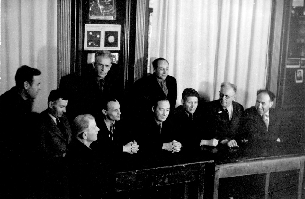 Преподаватели Красноярского государственного педагогического института. В первом ряду слева направо: А.И. Дрокин, А.Я. Власов, ?, В.Ф. Ивлев, Л.В. Киренский,?, П.А. Хромов, С.Л. Эдельман. Во втором ряду: М. Алдонин (слева), А.Е. Липкин., фото 1955 года.