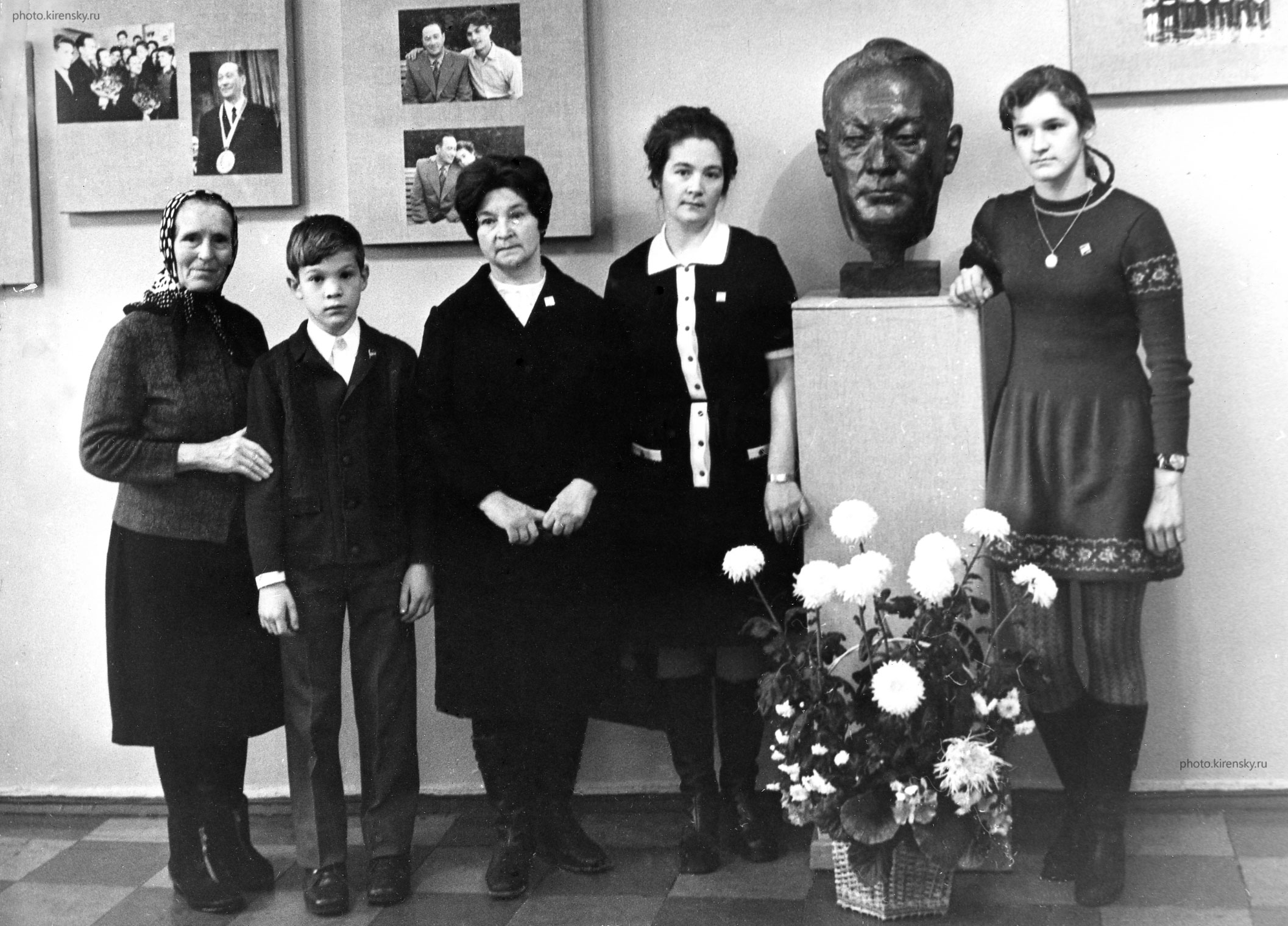 1974 год. Родственники академика Л.В. Киренского, приехавшие на открытие памятка Леониду Васильевичу. Он похоронен в Академгородке Красноярске напротив здания Института физики им. Л.В. Киренского Сибирского отделения Российской академии наук в 1969 году. Слева направо: Нина Васильевна, сестра; Леонид – младший внук, назван в честь дедушки; супруга Леонида Васильевича – Зинаида Яковлевна Киренская; дочь - Татьяна и внучка Ирина.