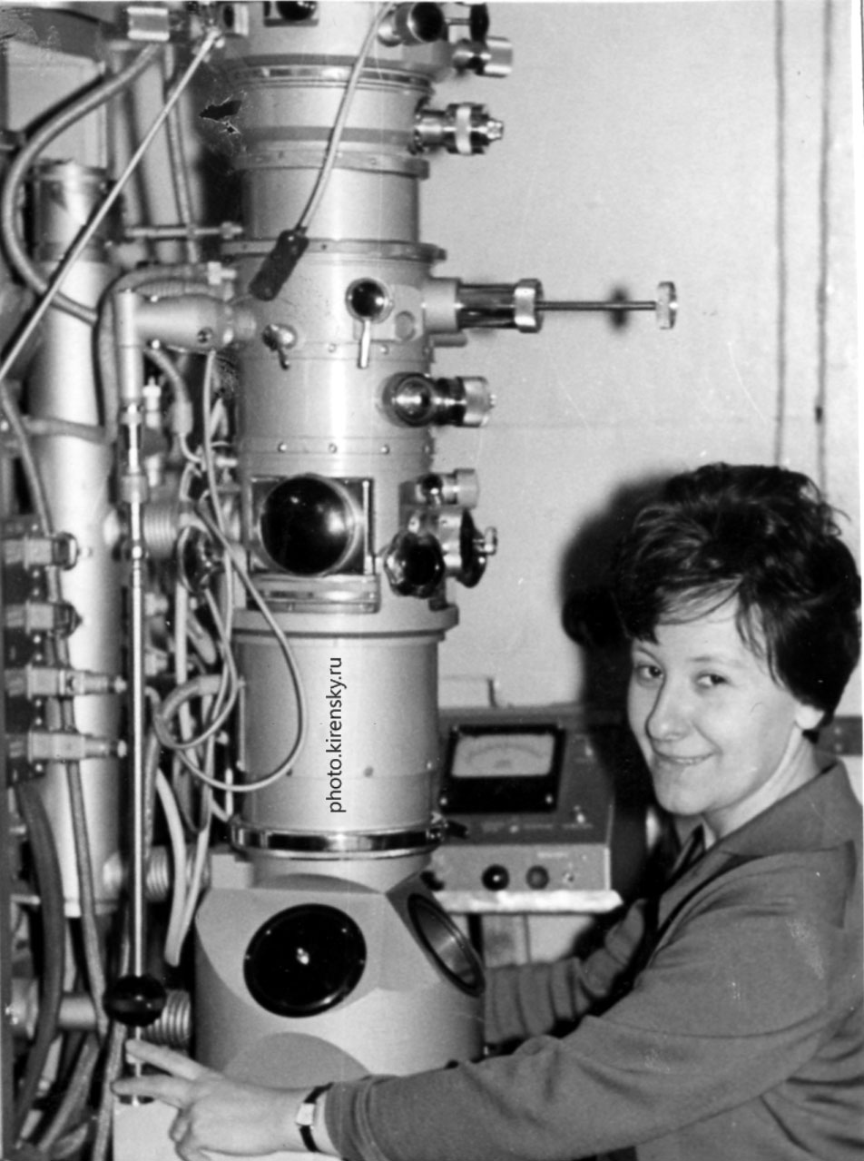 1967 год. На снимке аспирант С.Г. Русова. Занималась исследованием доменной структуры пленок на электронном микроскопе УЭМВ-100 в лаборатории структурных свойств тонких магнитных пленок Института физики Сибирского отделения Академии наук СССР (ИФ СО АН СССР) (СО АН СССР с 1991 года СО РАН). Красноярск.
