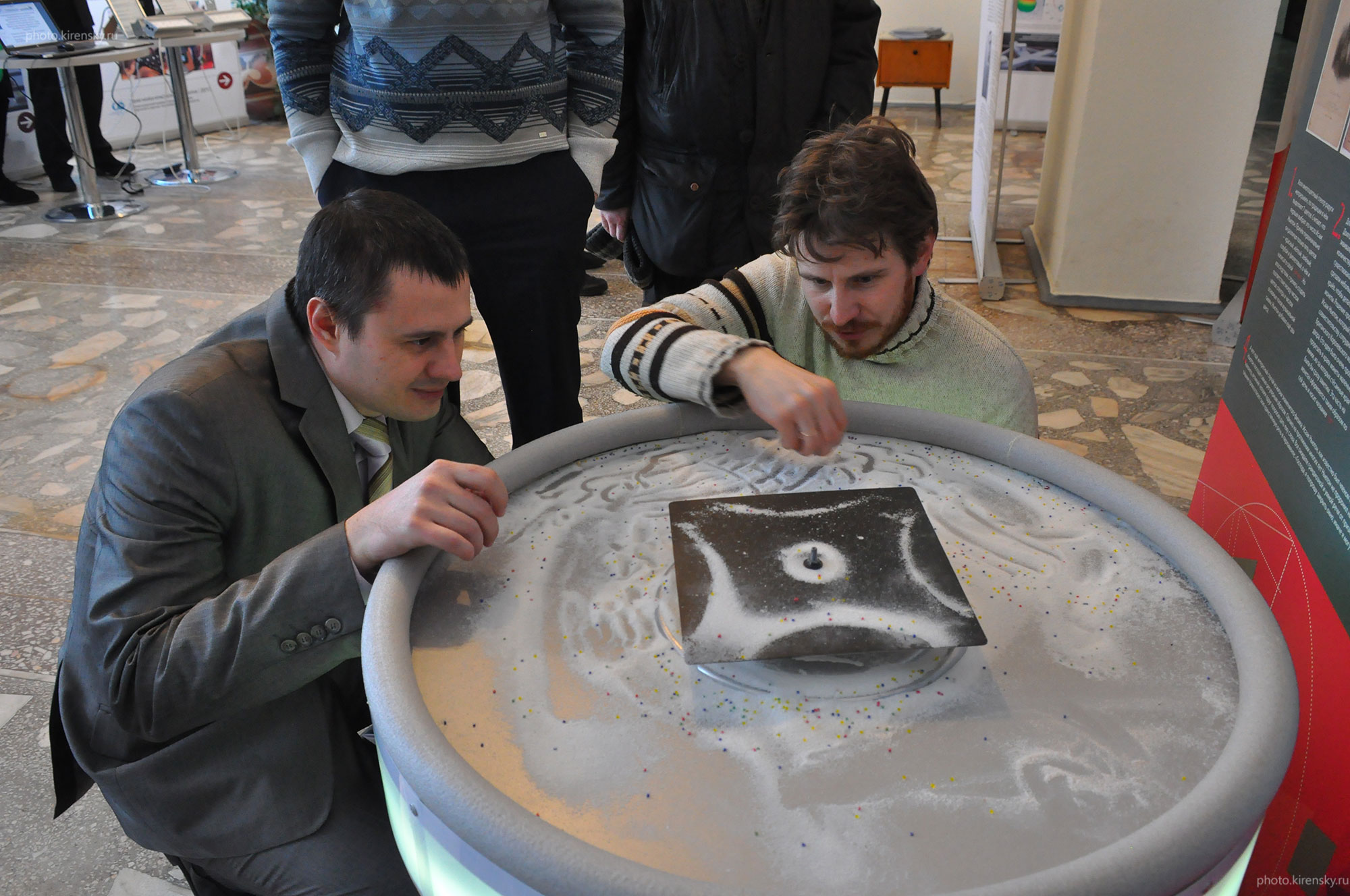 Шарыпов Антон Валерьевич (справа), кандидат физико-математических наук, научный сотрудник лаборатории когерентной оптики Института физики им. Л.В. Киренского Сибирского отделения Российской академии наук (ИФ СО РАН) с 2004 по 2019 год. Один из создателей «Ньютон Парка» в Красноярске. Снимок 2014 года