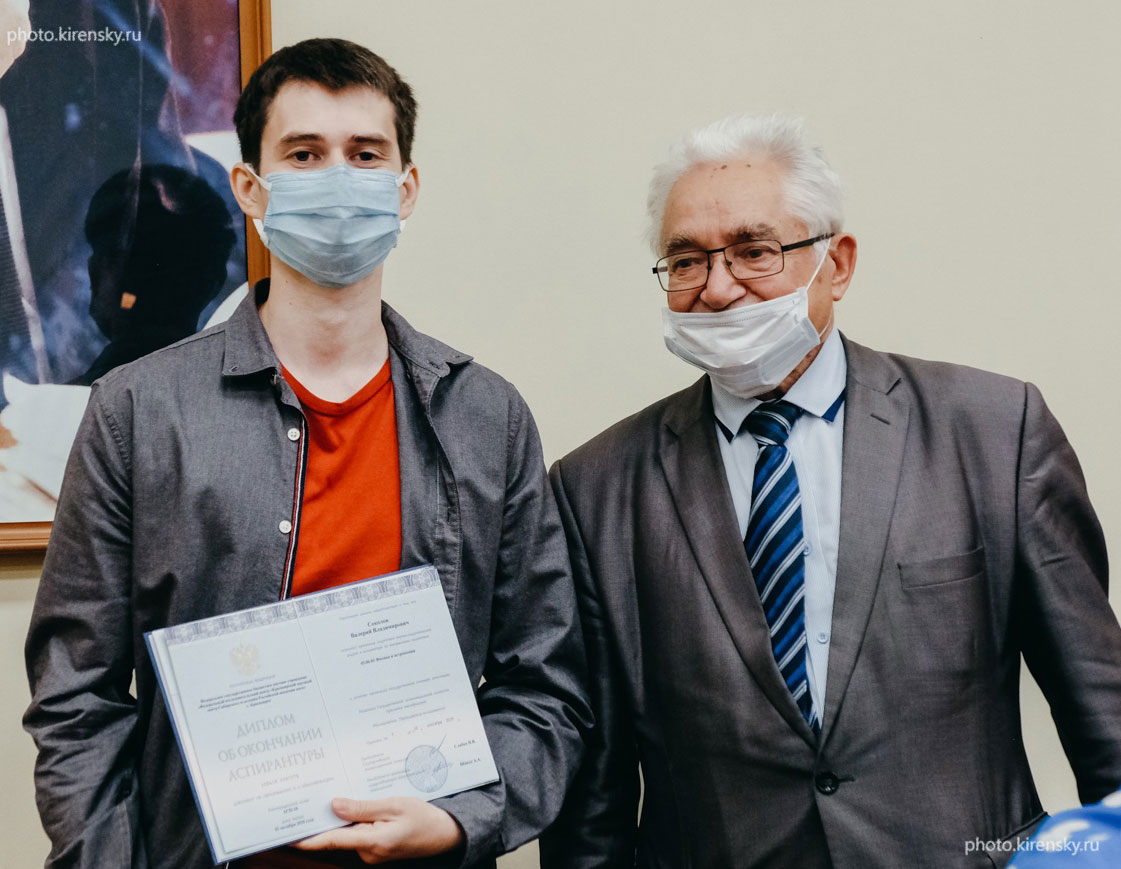 Соколов Валерий Владимирович (слева), научный сотрудник лаборатории физики магнитных явлений Институте физики им. Л.В. Киренского Сибирского отделения Российской академии наук на церемонии вручения диплома об окончании аспирантуры в 2020 году. Год эпидемии коронавируса в мире. Диплом вручает академик Василий Филиппович Шабанов.