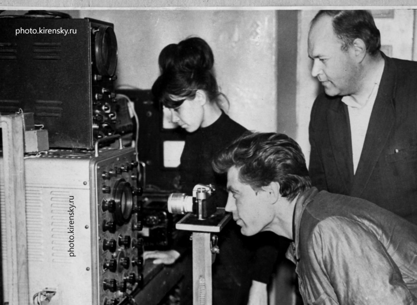 1962 год. За установкой, слева направо: Л.В. Лазарева, В.П. Рябинин, С.Я. Кипарисов, сотрудники лаборатории физики магнитных явлений Института физики Сибирского отделения Академии наук СССР (ИФ СО АН СССР). Красноярск.