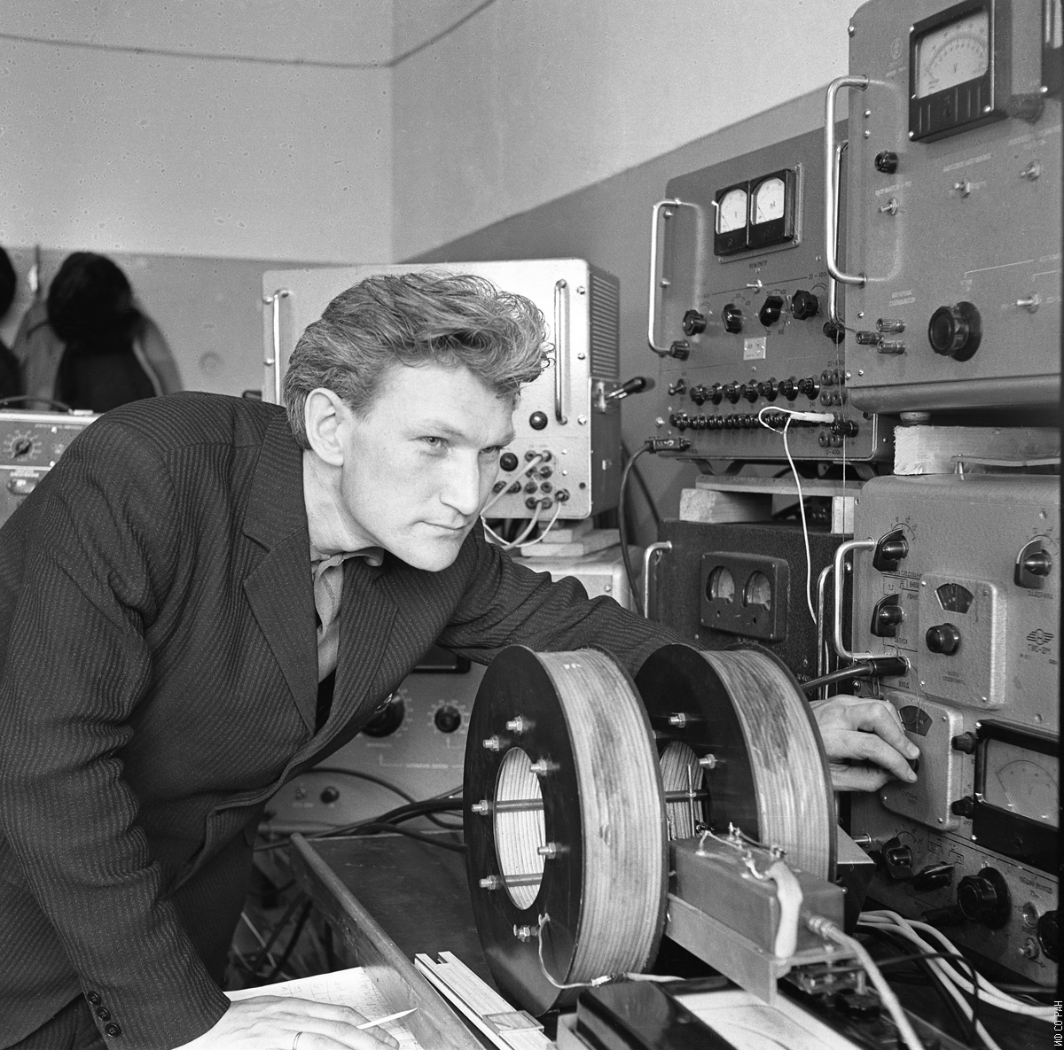 Мальцев В.К., инженер лаборатории высокочастотных и импульсных свойств тонких магнитных пленок Института физики им. Л.В. Киренского Сибирского отделения Академии наук СССР (ИФ СО АН СССР), за работой на установке по исследованию явления ядерного магнитного резонанса в тонких магнитных пленках. Красноярск. 1972 год.