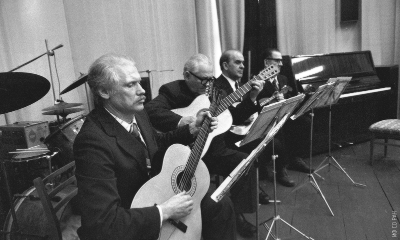Турпанов Игорь Александрович (слева), участник праздничного концерта, посвященного 25-летию Института физики им. Л.В. Киренского Сибирского отделения Академии наук СССР (ИФ СО АН СССР). Снимок 1981 года. Ансамбль был создан в Институте физики Беляевым Борисом Афанасьевичем.