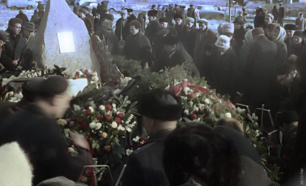 В день похорон академика Л.В. Киренского 9 ноября 1969 г. в Академгородке Красноярска, напротив Института физики СО АН СССР, организатором которого он был.