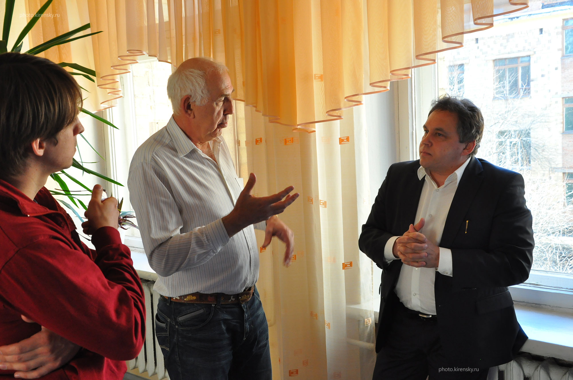Слева направо: Платунов Михаил Сергеевич, Овчинников Сергей Геннадьевич и Волков Никита Валентинович, сотрудники Института физики им. Л.В. Киренского Сибирского отделения Российской академии наук в перерыве заседания ученого Совета в Мае 2015 года.
