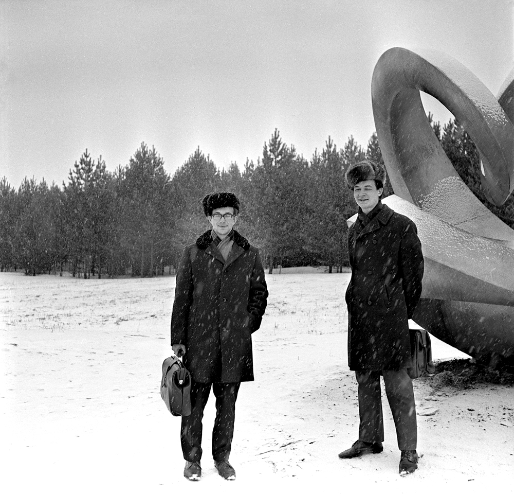 Фото на память. На снимке, сотрудники отдела биофизики Института физики им. Л.В. Киренского Сибирского отделения Академии наук СССР (ИФ СО АН СССР), Ваганов Е. А. (слева) и Харук В. И. у "Соленоида" - абстрактной фигуры, установленной перед зданием института. Эта работа была выполнена московскими скульпторами Лемпортом В.С. и Силисом Н.А. по просьбе директора института академика Киренского Л.В. Снимок 1973 года. Красноярск.