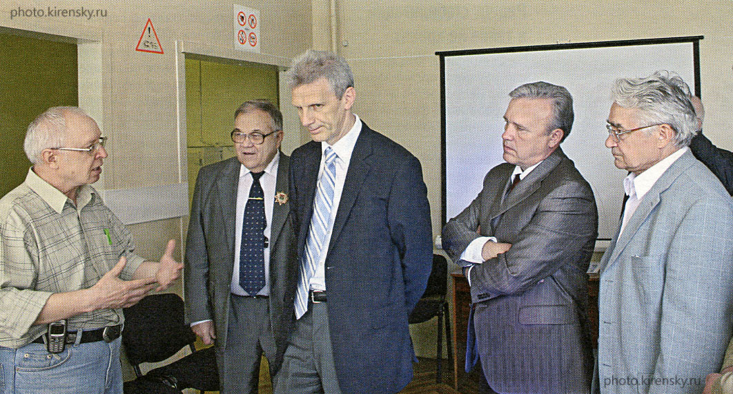 2006 год. Во время визита в Красноярск министр образования и науки Российской Федерации А.А. Фурсенко посетил Институт физики им. Л.В. Киренского Сибирского отделения Российской академии наук (ИФ СО РАН). В лаборатории радиоспектроскопии и спиновой электроники, слева направо: рассказывает О.В. Фалалеев, старший научный сотрудник лаборатории; академик Н.Л. Добрецов, председатель Президиума СО РАН; А.А. Фурсенко; А.В. Усс, губернатор Красноярского края и В.Ф. Шабанов, председатель Президиума Красноярского научного центра СО РАН.