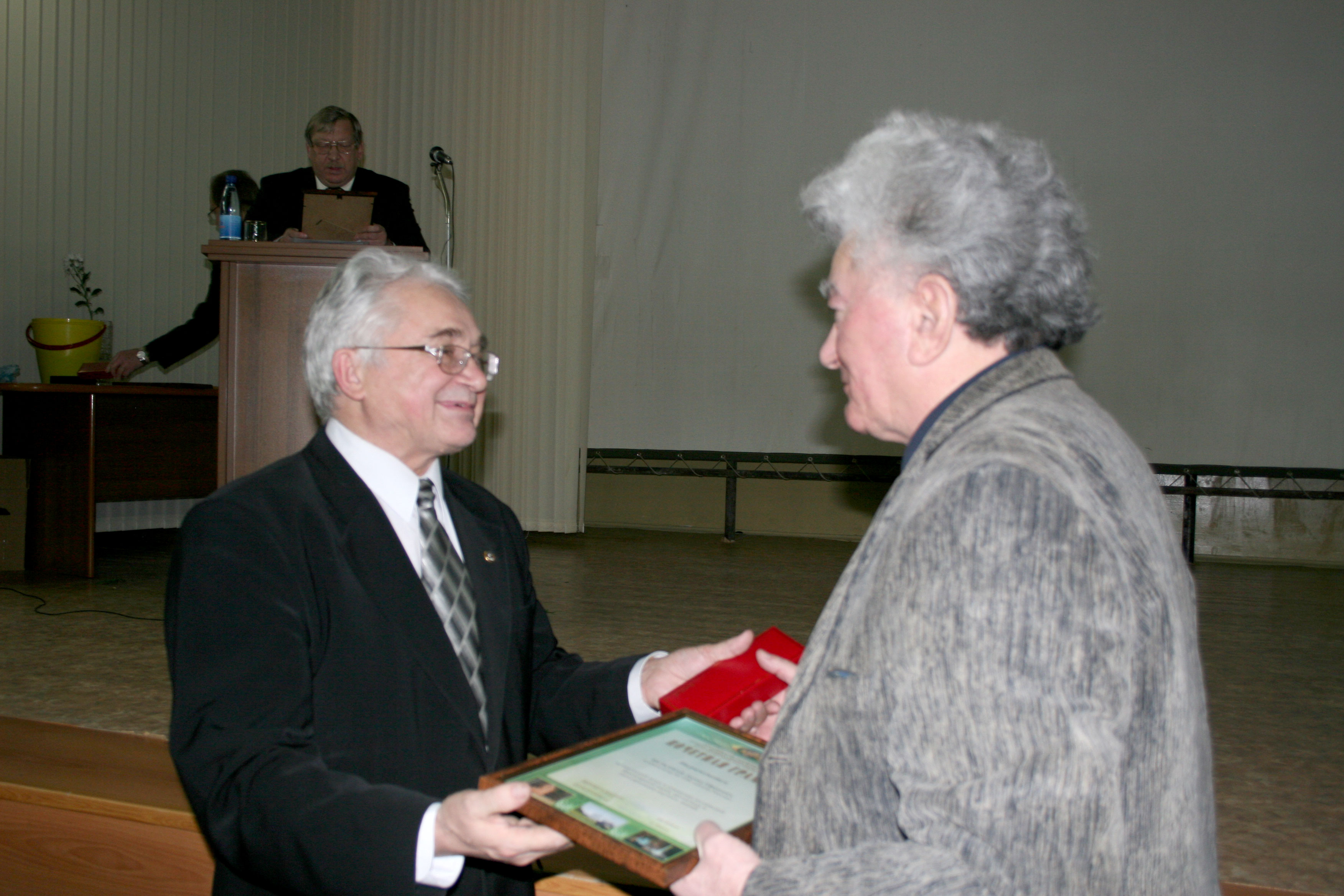 Академик В.Ф. Шабанов (слева), председатель Президиума Красноярского научного центра Сибирского отделения Российской академии наук (КНЦ СО РАН), вручает почетную грамоту и памятный знак телерадио обозревателю Л.Е. Фельдману. 2008 год. Красноярск.