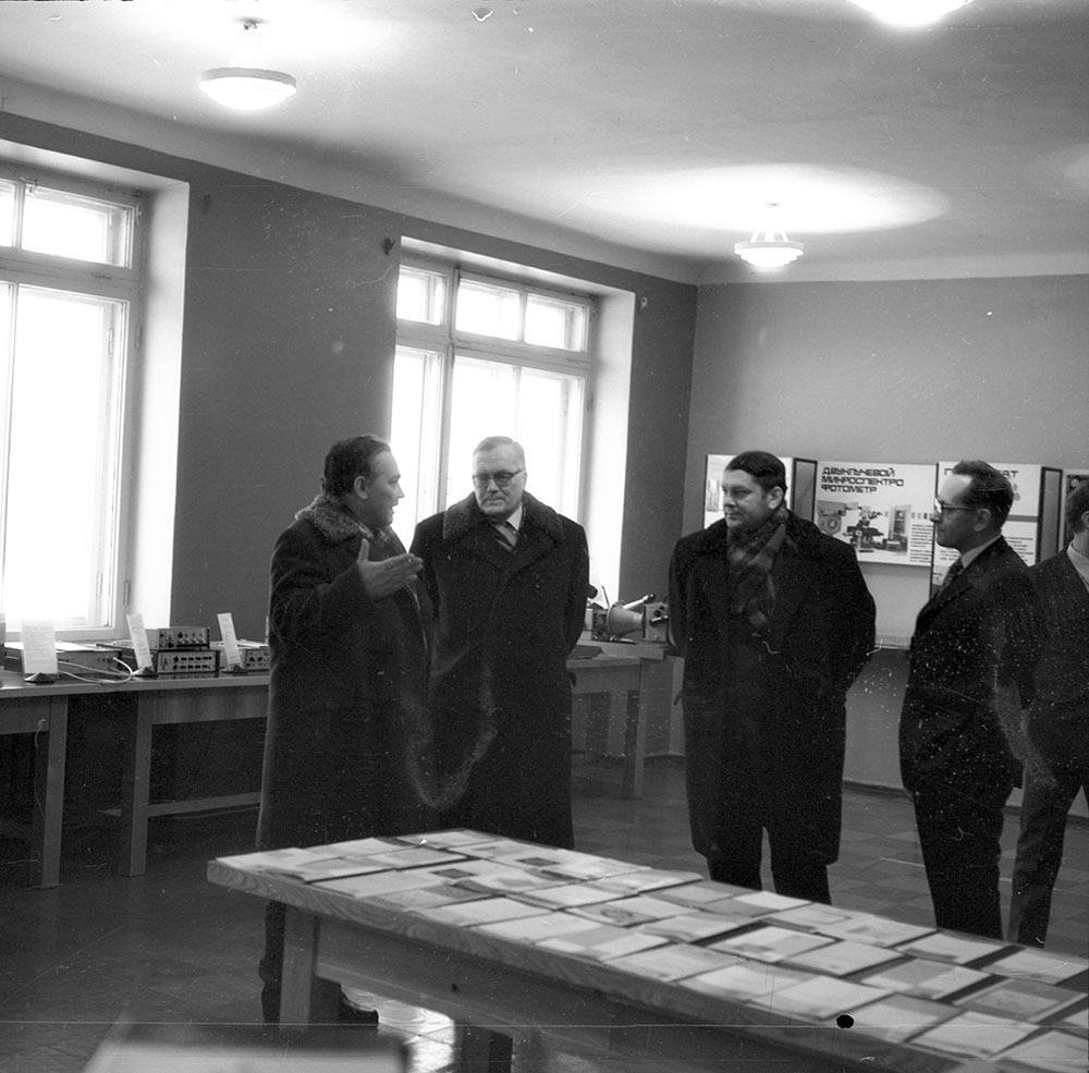 1974 год. Выставка достижений Института физики им. Л.В. Киренского Сибирского отделения Академии наук СССР, организованная в холле института и приуроченная ко времени визита в институт заместителя председателя Государственного комитета СССР по науке и технике Кириллина В.А. и первого секретаря Красноярского краевого комитета коммунистической партии Советского Союза (КПСС) Федирко П.С.. Слева направо: Терсков И.А., директор института; Кириллин В.А., Федирко П.С., Александров К.С., заместитель директора института по научной работе. Красноярск.