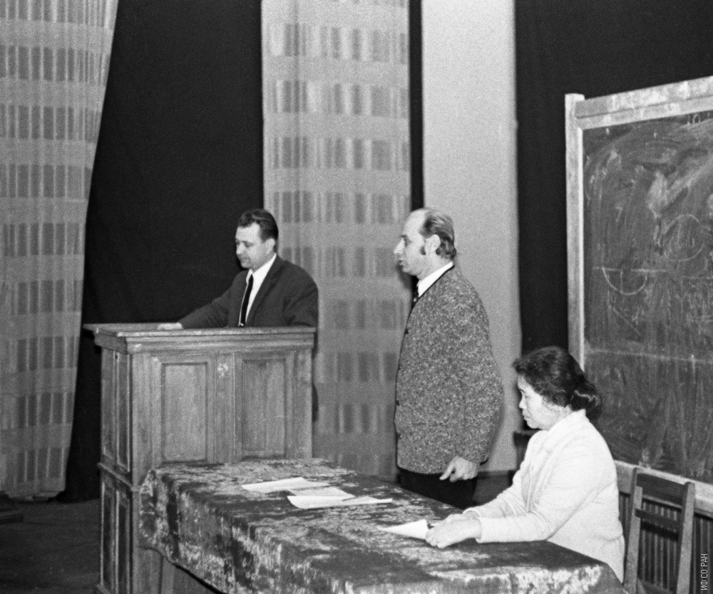 Заседание группы народного контроля Института физики им. Л.В. Киренского Сибирского отделения Академии наук СССР (ИФ СО АН СССР), слева направо: Людвиг Эдуард Жак Рудольф, Смолин Роберт Павлович, Жеребцова Любовь Ивановна, фото 1973 года. Красноярск.
